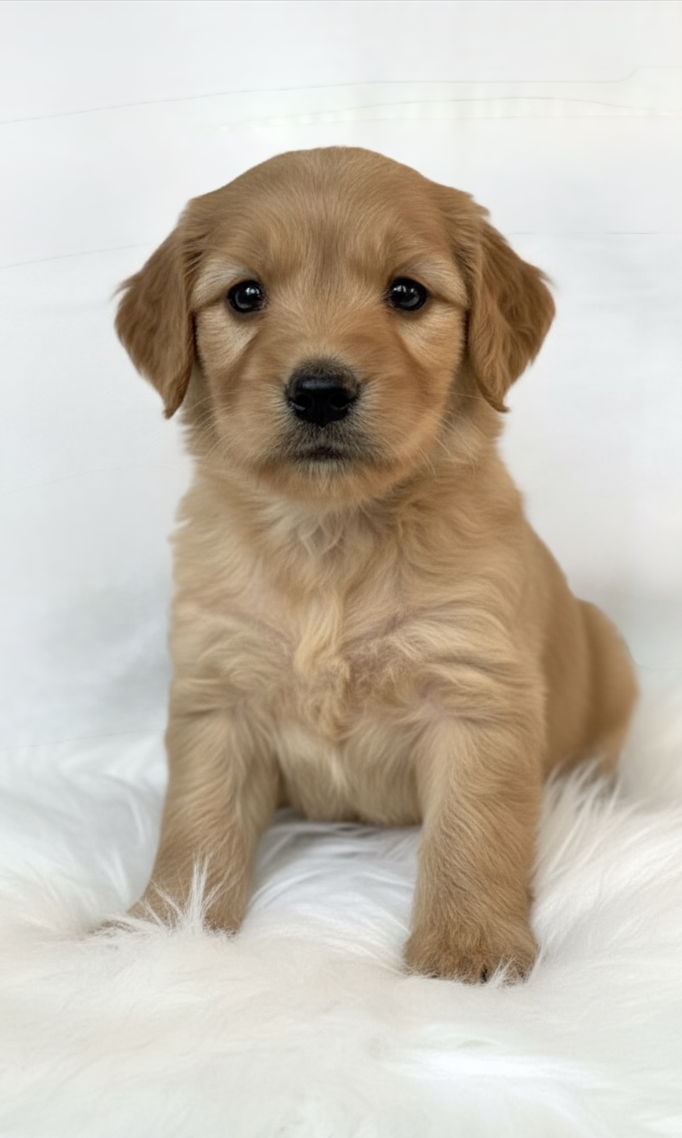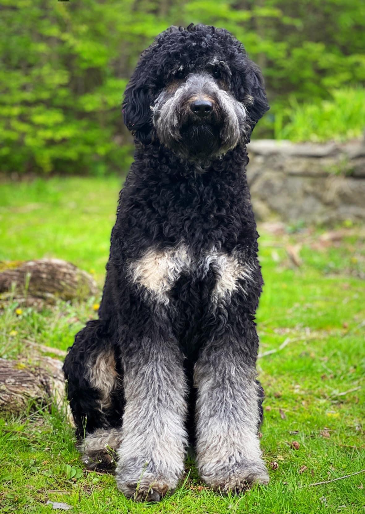 Charlie reminds me so much of her momma, Addie. She’s a sweet & lovely girl. She is a confident and friendly, sweet, happy, well mannered, and perfect family dog. She has gorgeous conformation and a silky wavy fleece coat. Charlie is a brilliant addition to our breeding program and is very devoted to her family. She is calm, smart, and just a gentle loving girl. Nowhere near as big as her mom but a nice size.