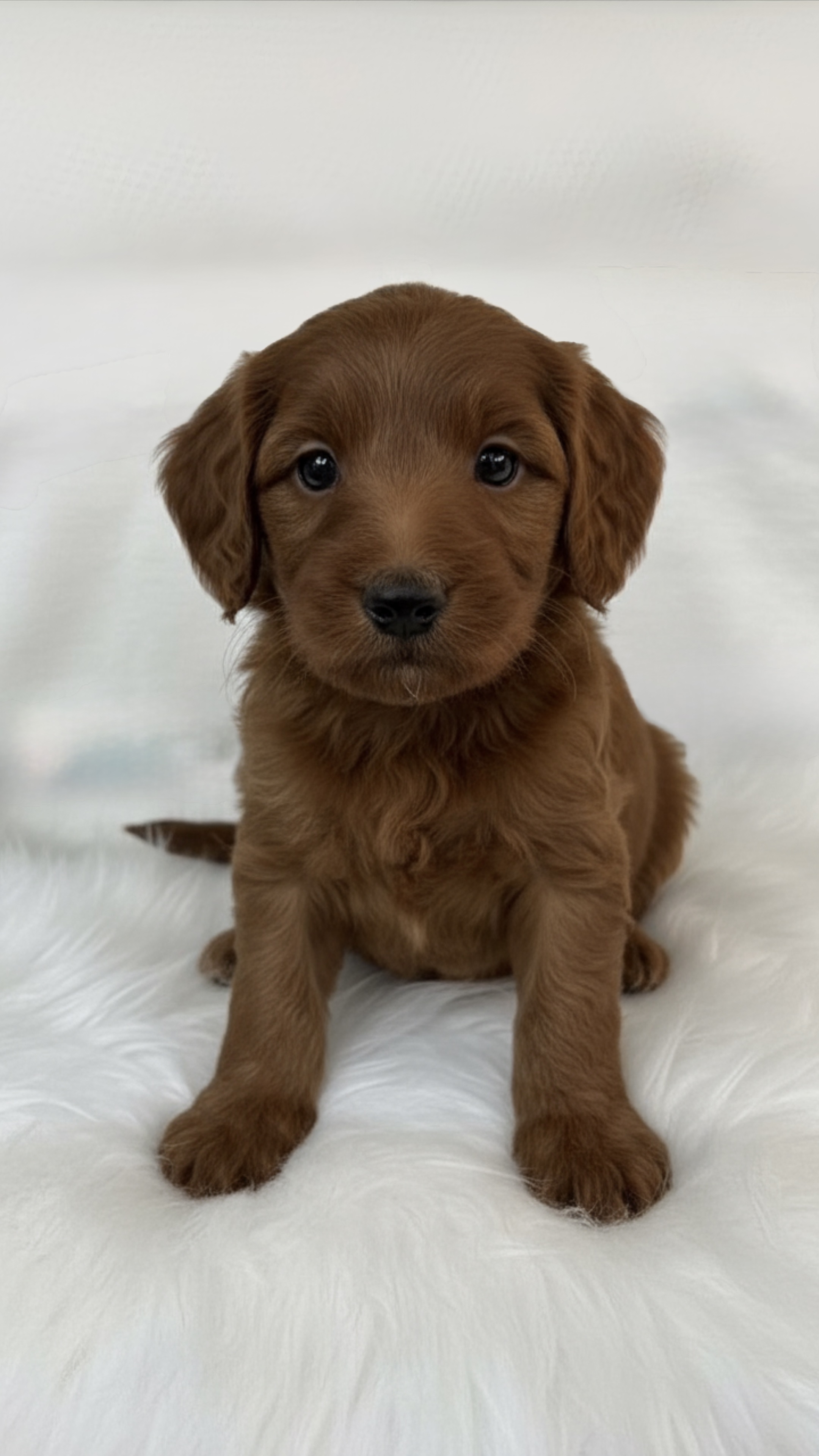 Jasper is one of a kind! He has a super soft curly fleece coat and an infectious personality. Jasper has not yet met a person or a dog he didn't love. Not only is he a good looking mini Goldendoodle but he is outgoing, friendly and full of fun. Jasper loves to meet and greet people with enthusiasm. Jasper feels life is for living and each day is new opportunity for fun. His gorgeous red and white parti markings draw people to him and he never turns away the opportunity or attention. This happy boy is the ideal size, a beautiful mini who can be paired with many of our girls to create the ideal size. Jasper’s puppies are full of love and bring smiles to many faces. Jasper Is a proven stud and has produced many gorgeous beautiful healthy puppies!